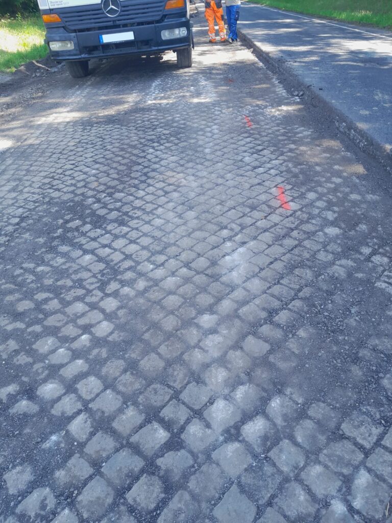 Aktuell bauen wir auf der B96 zwischen Mittelherwigsdorf und Oderwitz hochwertiges Bestands-Granit-Kleinpflaster aus – insgesamt ca. 3.000 Tonnen! Ideal für Hofeinfahrten, Wege oder andere Naturstein-Projekte.